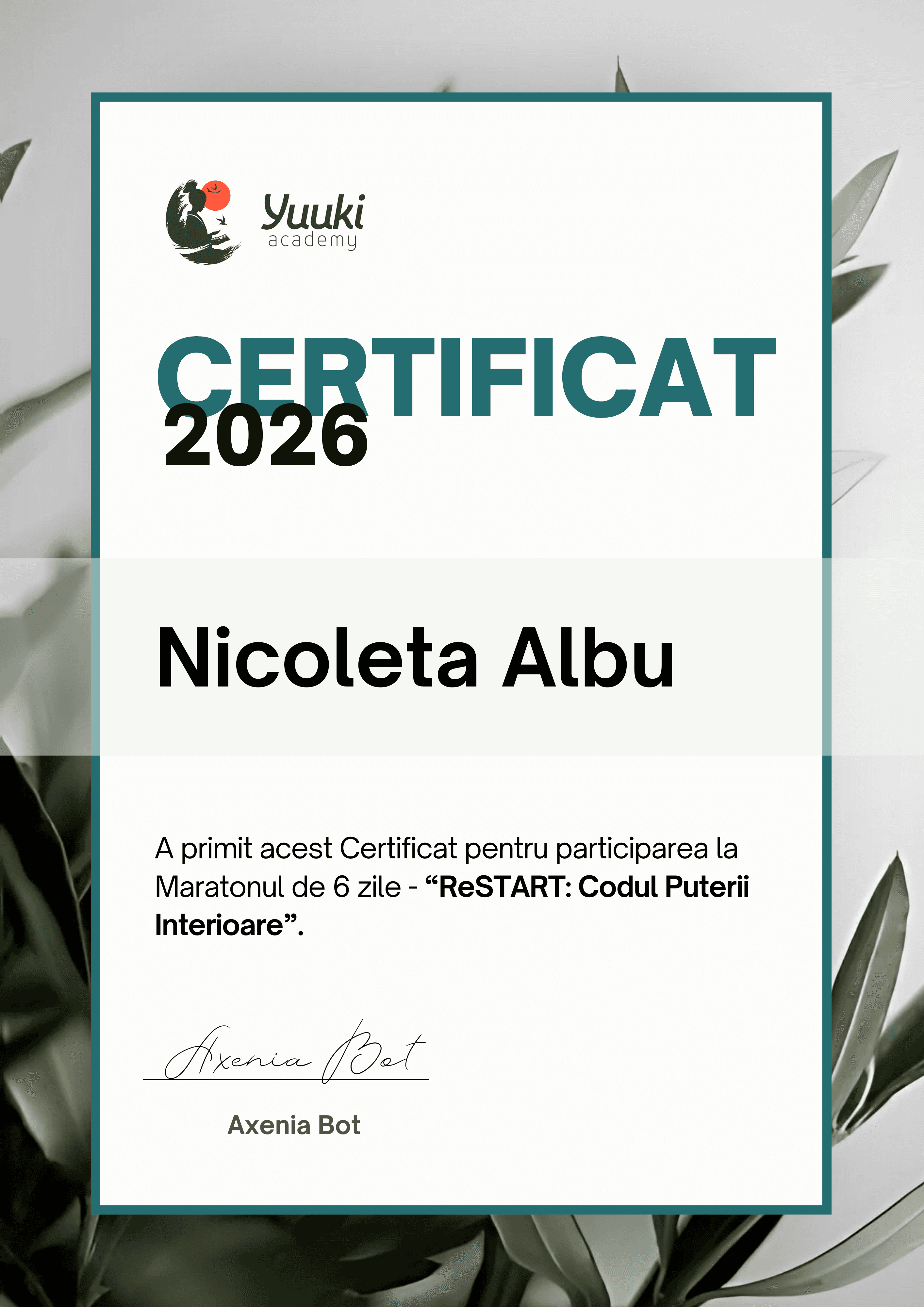 Participă live în fiecare zi și, pe lângă cunoștințele valoroase pe care le vei dobândi, vei primi și un certificat de participare exclusiv. Certificatul e dovada că ai ales să faci ceva pentru tine, pentru viața ta, și că ai făcut un pas uriaș spre a-ți realiza toate dorințele.